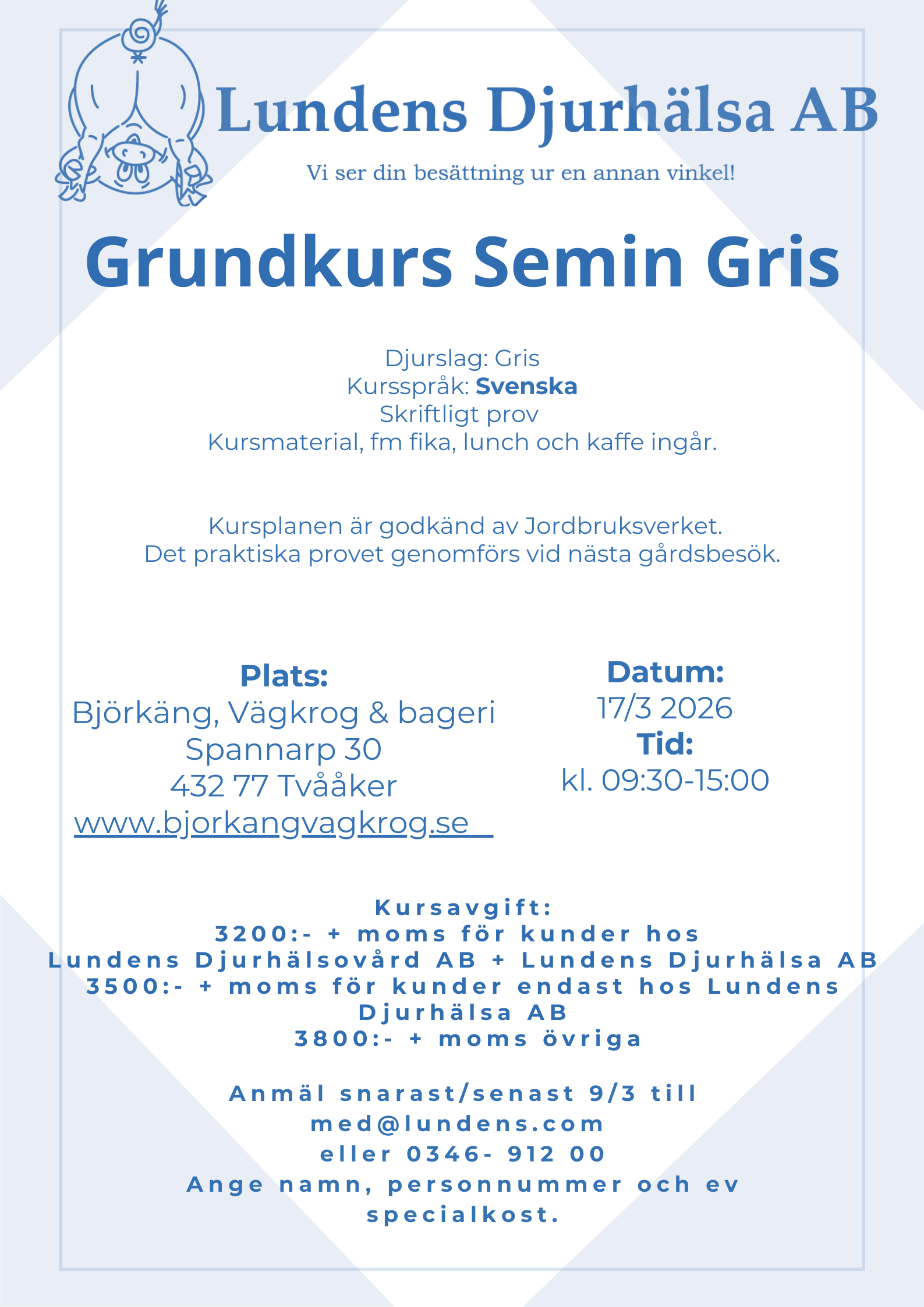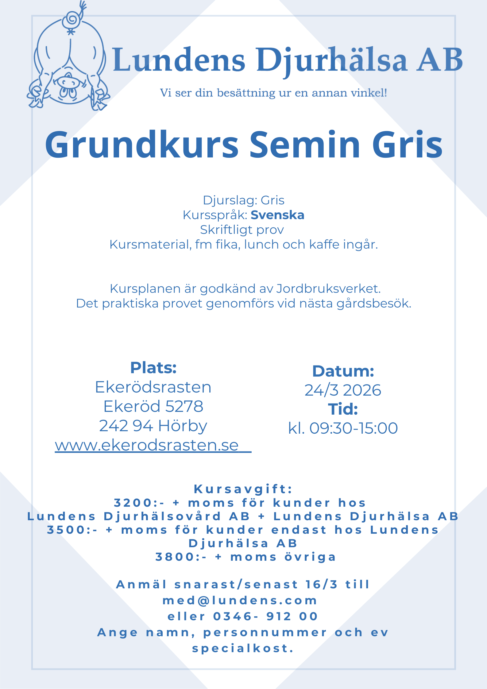 Grundkurs Semin Gris 25 februari, 2026 7 Lundens erbjuder från och med 2026 Grundkurs Semin Gris. Första tillfället är 17 mars som sker fysiskt i Halland och andra tillfället är 24 mars som sker fysiskt i Skåne. Klicka in er på bilderna ovan för mer information. Varmt välkomna till kontoret med er anmälan 0346 912 00 eller med@lundens.com